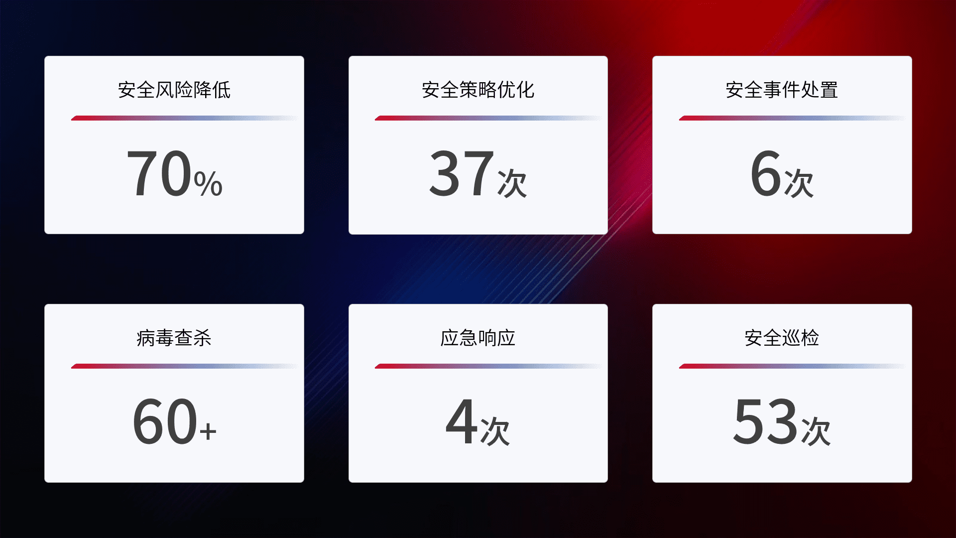 提供全面的安全事件报告体系,,,,包括处置报告、、、周报、、季度和年度总结,,结合持续监控,,帮助客户深入了解网络安全状况。。。。